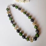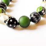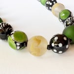 Composed of twenty five hand made glass beads this necklace celebrates my love of colour compositions in glass. Sage green, black and white, and a taupe repeated in dot, scroll and twisted cane with some beads left shiny and some treated to a matt finish.