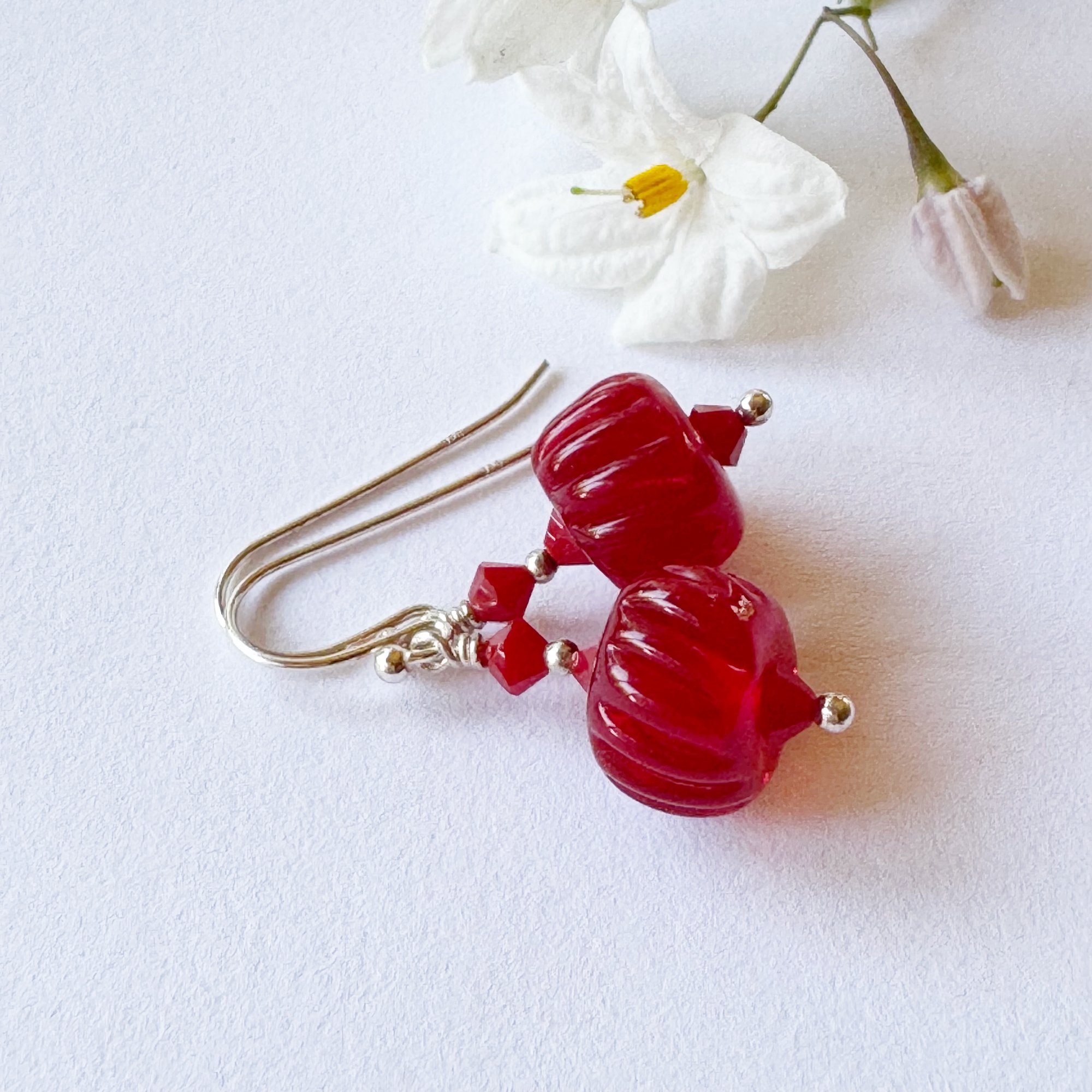 Transparent red beads with some textured lines around the sides. I have used Swarovski crystals to finish these petites.