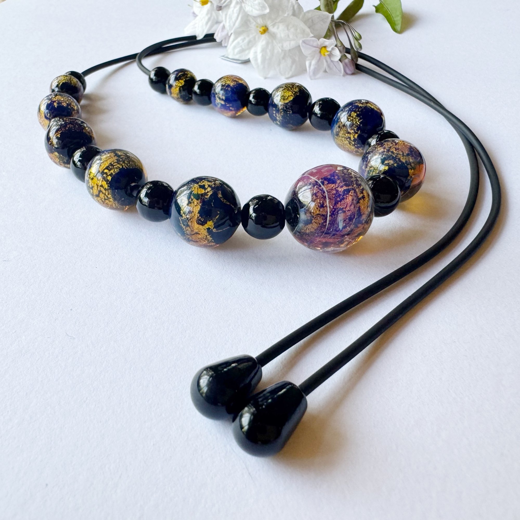 Feature beads here (eleven) are begun with black glass, rolled in gold leaf, encased in reduction glass and finally encased in clear. Between feature beads are twelve small black rounds. Twenty six hand made glass bead components in total.
