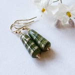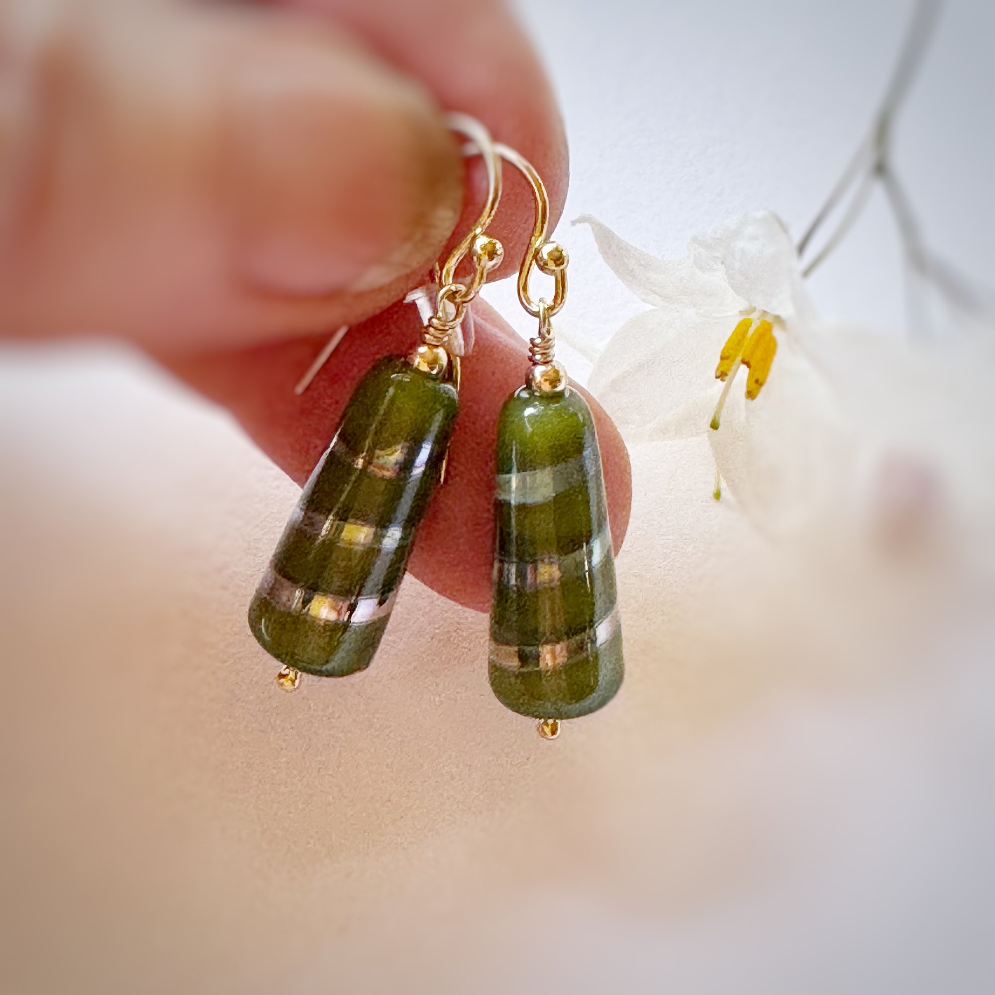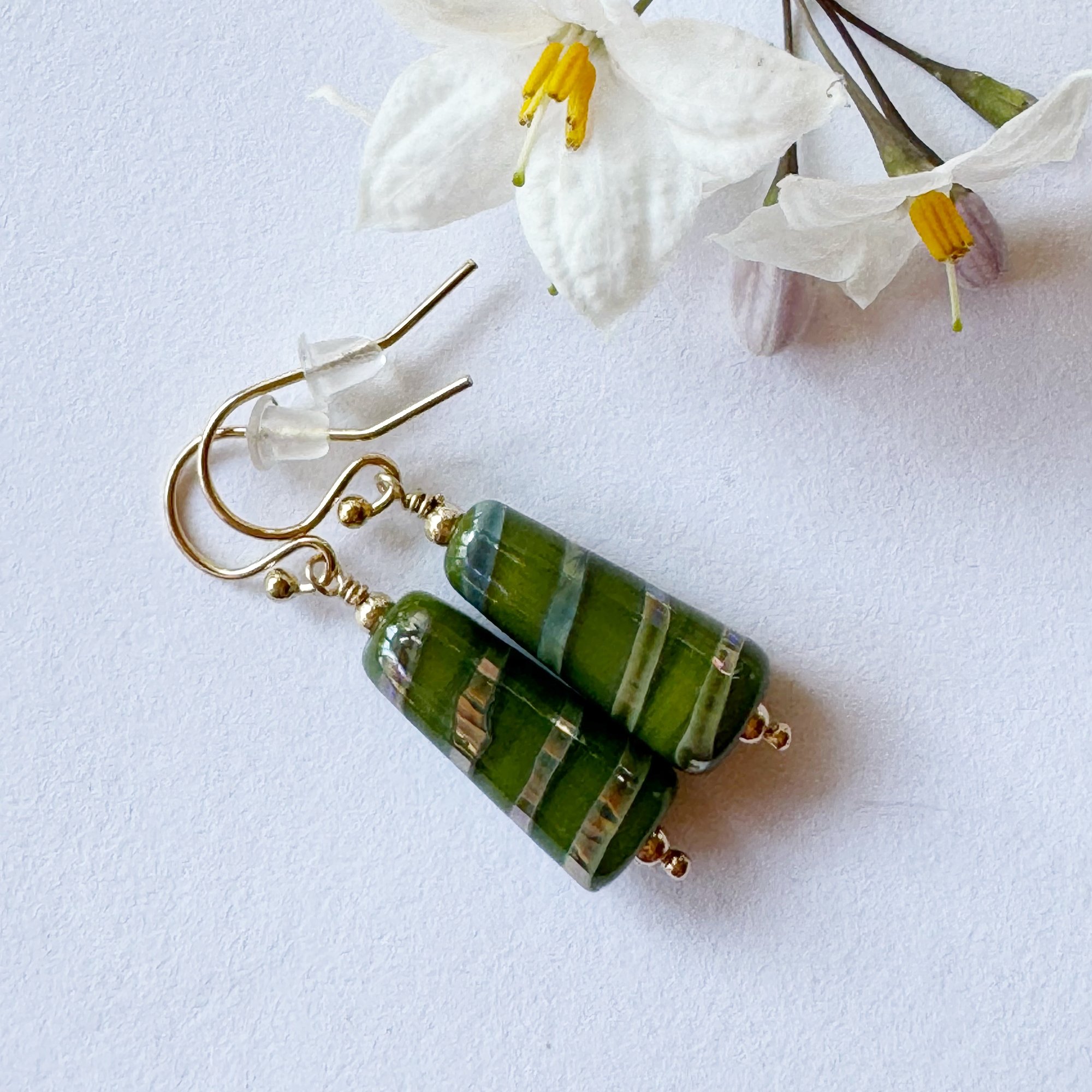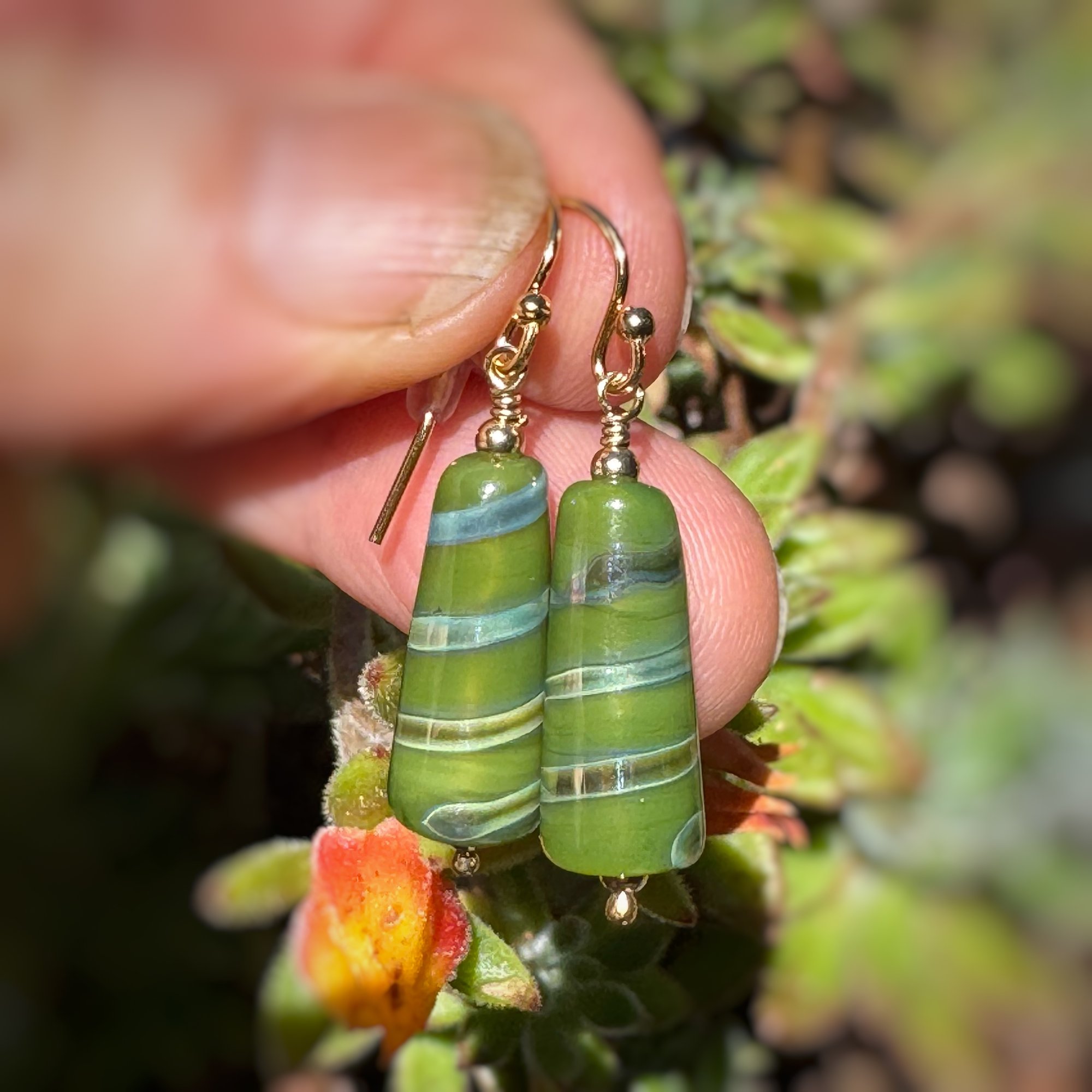 Olive green opaque with lustre spiral line feature in these hand made glass beads.