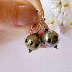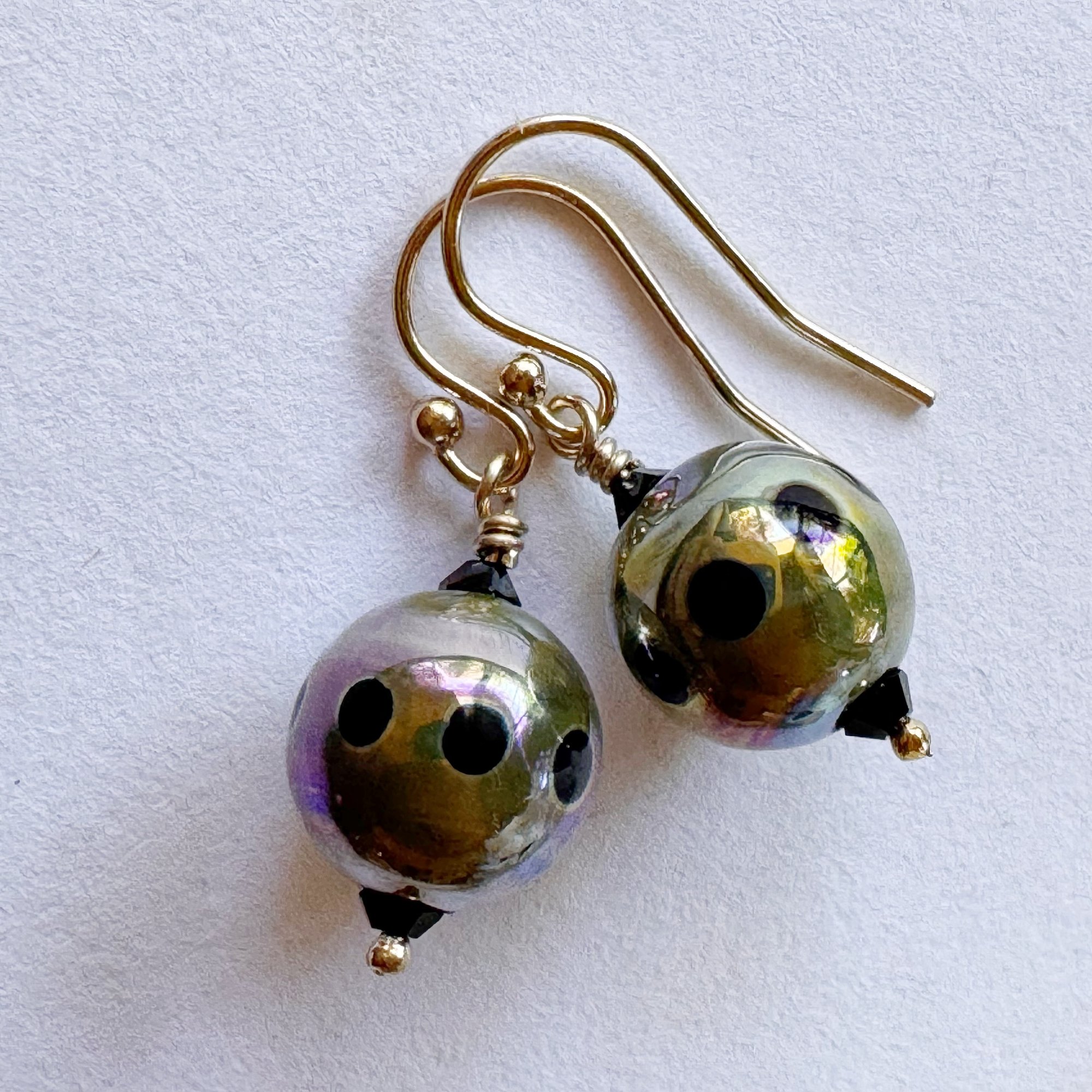 I used a beautiful reduction lustre glass for these petite rounds and decorated with small black dots around the belly. Swarovski crystals make these an elegant option paired with Rolled Gold hooks.