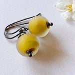 A layer of clear glass covers the centre core of mustard opaque glass and treated to a silky matt finish. The colour glows through the clear in these hand made glass beads.