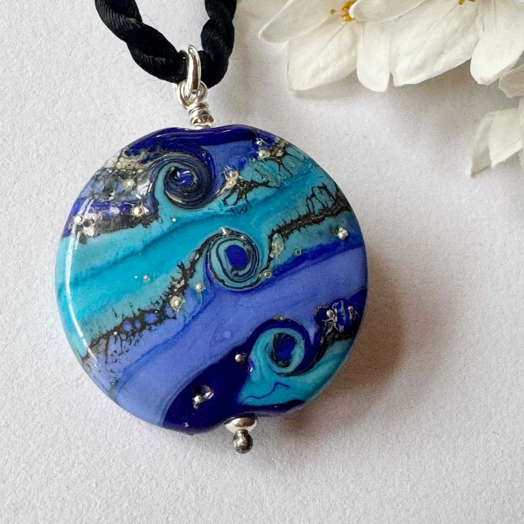 Here we have cobalt, dark lapis, dark periwinkle and aqua with silvered ivory and silver wire. On the surface of the bead the silver is pooled in beads on the surface to sparkle. I've introduced swirls and dots under clear encasement on the feature side left raised.