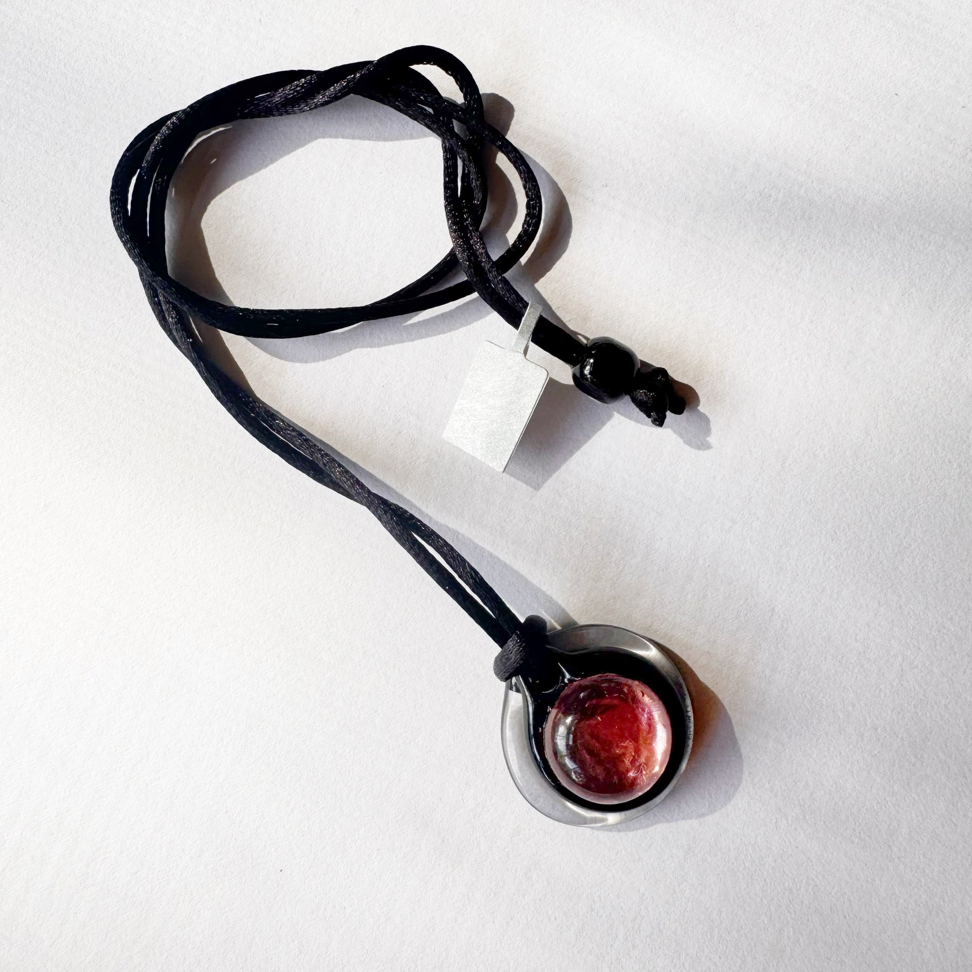 Supplied with black silk cord looped through the opening and adjustable in length using the small slider bead. Wear at choker length or maximum of 26 inches.