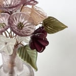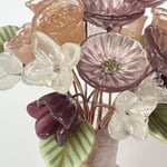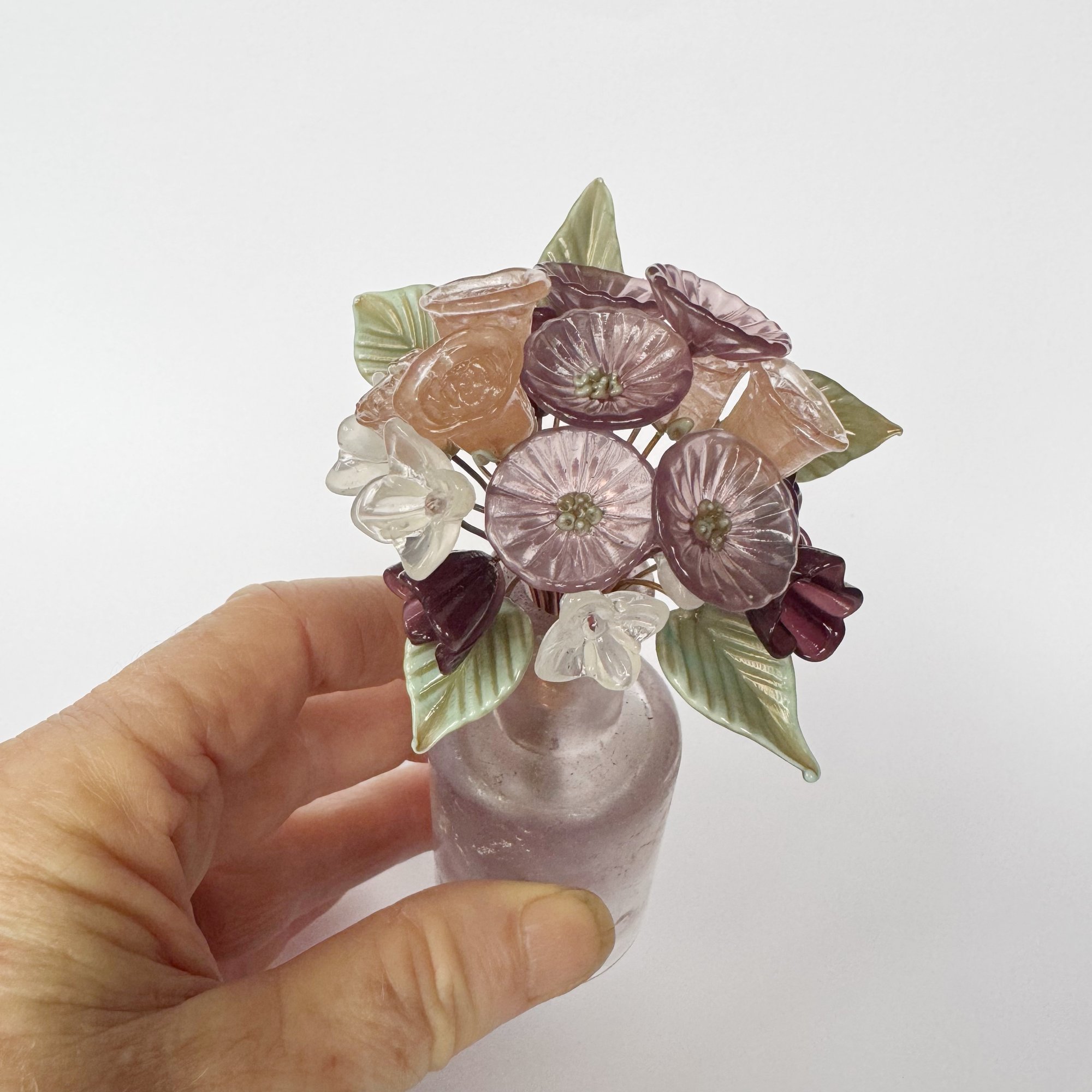 A collection of 5 roses, 5 daisies, 5 starflowers, 5 bellflowers with 5 leaves featuring solf pinks with clear starflowers and deep aubergine bellflowers all contained in a vintage bottle with a soft violet hue.
