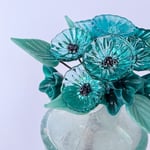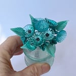 Posy collection in green consisting of 9 daisies in differing shades of green, 5 green starflowers and 5 green leaves together with a vintage green in bottle.
