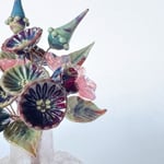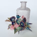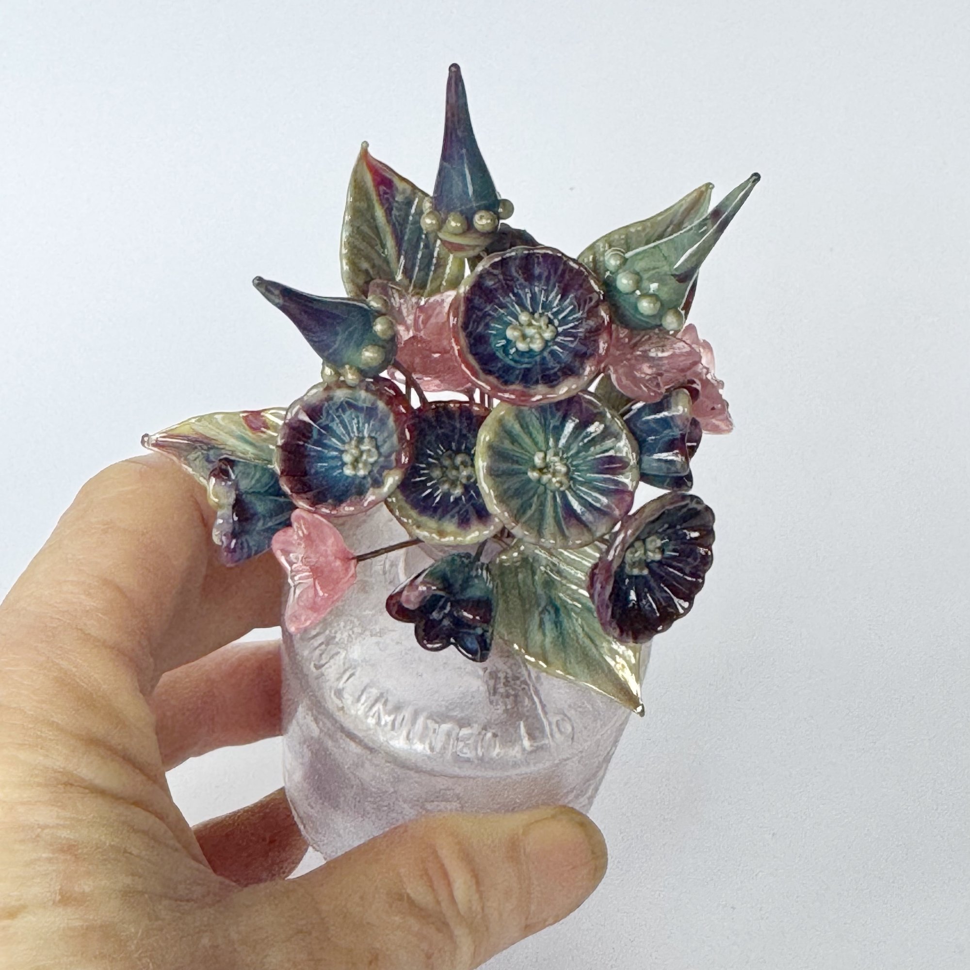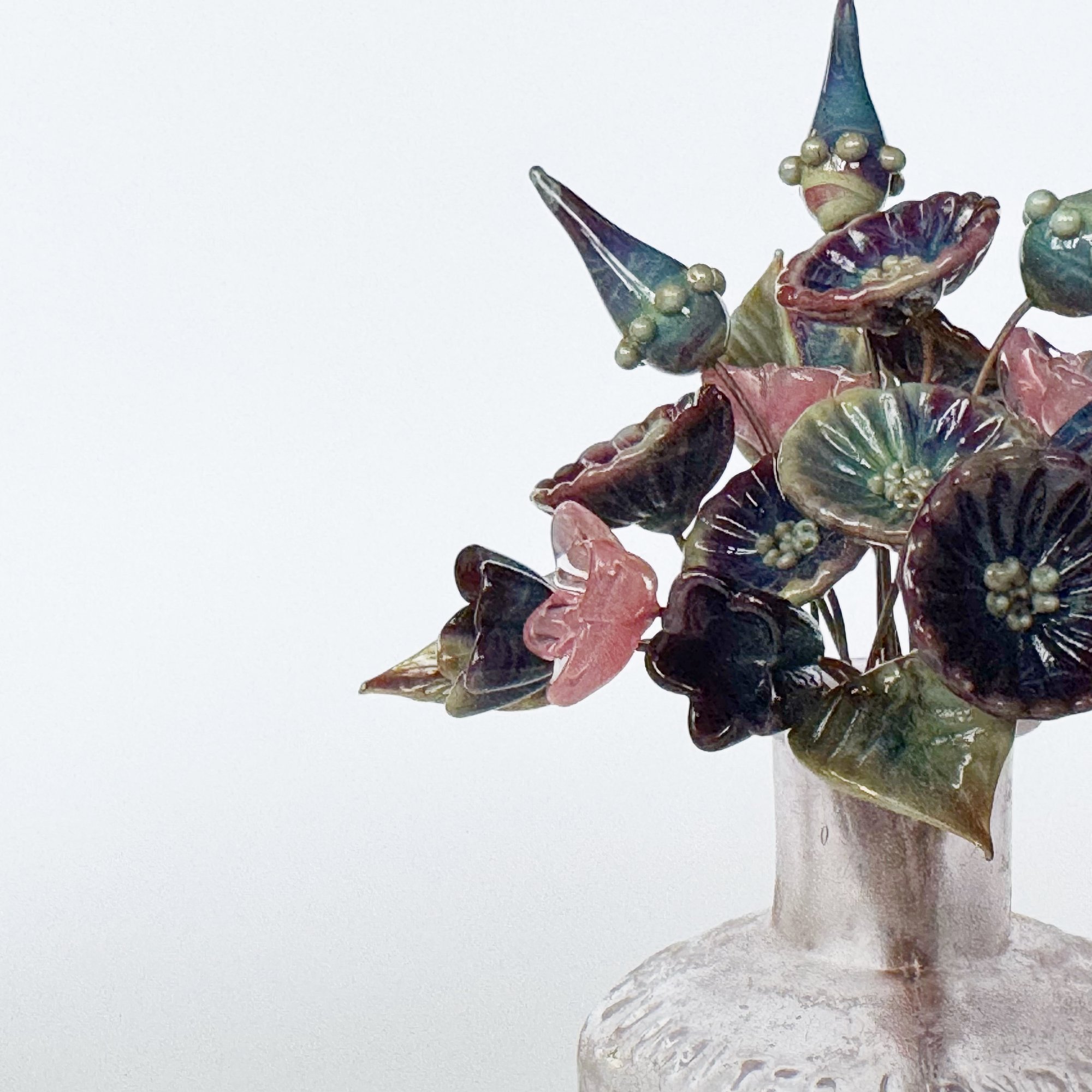 I used a colour called dark multicolour to mak most of these elements. It's a rich colour with strikes various colours depending on heat and cooling times. The collection composes 6 daisies, 5 leaves, 3 bellflowers and 3 pod spikes all in multicolour with 5 pink starflowers.