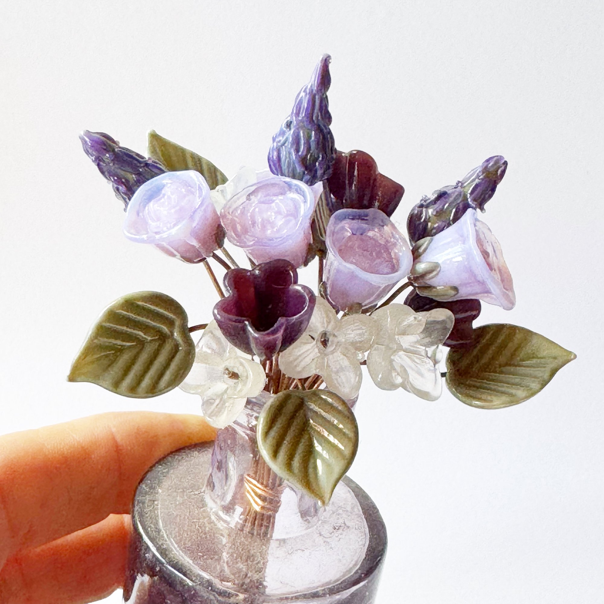 A posy collection featuring 5 violet roses, 3 lavender spikes, 5 starflowers, 3 bellflowers and 5 leaves all nestled in an antique bottle with a lavender hue.