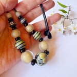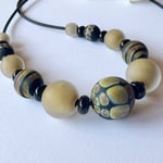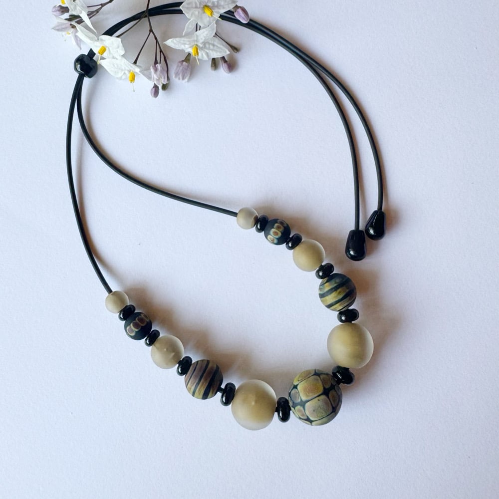 An adjustable necklace using raku glass on black for the decorated beads. Paired with the buff neutral colour under clear encasement together with shiny black for spacers, slider and ends. All feature beads are matt finished and a lovely tactile feel.