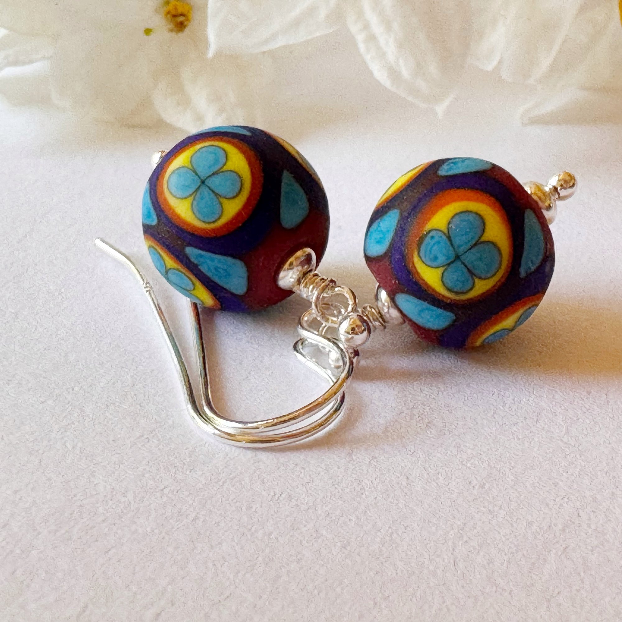 Beginning with a dark red opaque base these hand made glass beads are then layered with dots of blue, orange and yellow to frame my tiny aqua flowers.