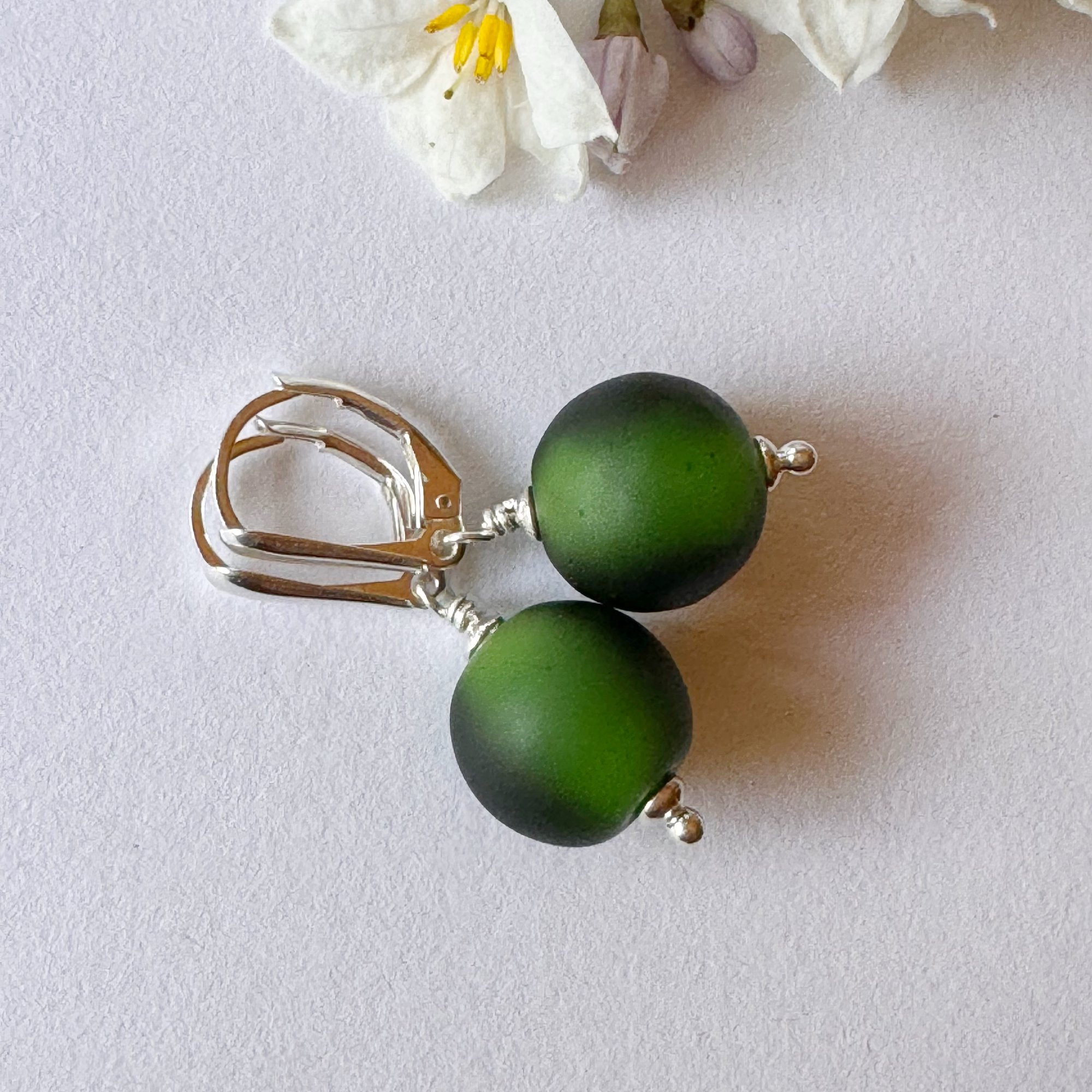 All metal is Stirling Silver and these come with wide fronted leverbacks. Overall length from top of hooks is 36mm and actual bead size is 13mm round.